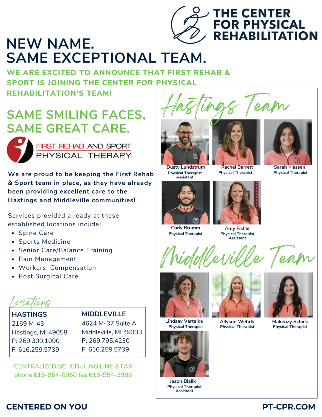 We are thrilled to officially open our two newest clinic locations in Middleville and Hastings! These clinics were formerly First Rehab and Sport, and we are honored to continue serving these communities with the same trusted care teams patients already know and love.