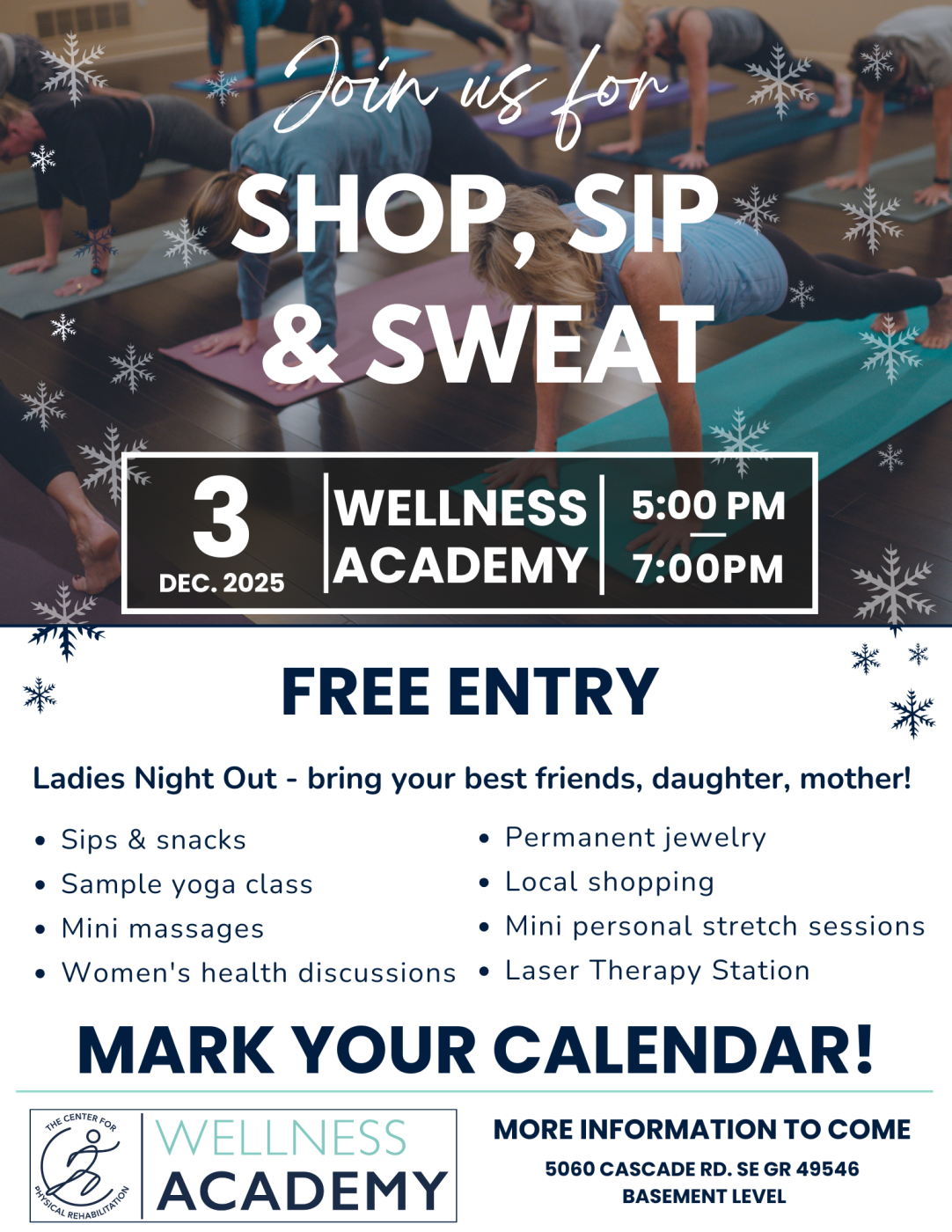 We are excited to be hosting our Annual Shop, Sip & Sweat event again in the Wellness Academy! Join us for a ladies’ night out of shopping, trying new wellness services, great snacks and a free yoga class! This event is FREE to all! More details coming soon, including a list of our great vendors!
