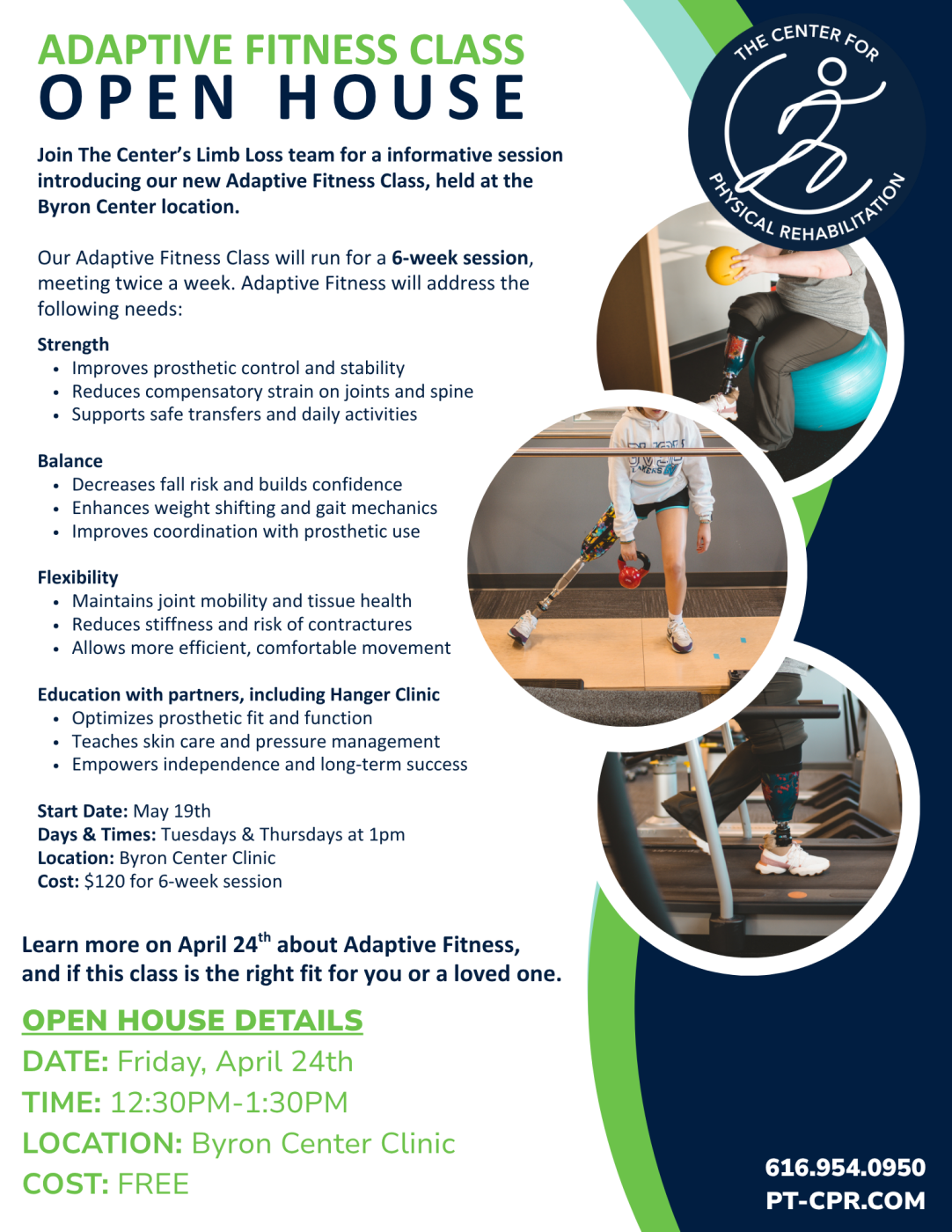 The Center for Physical Rehabilitation invites you to an upcoming Adaptive Fitness Class Open House at our Byron Center location. This informative session is designed for individuals with limb loss or prosthetic use who are looking to improve strength, mobility, and overall function in a safe, supportive environment.